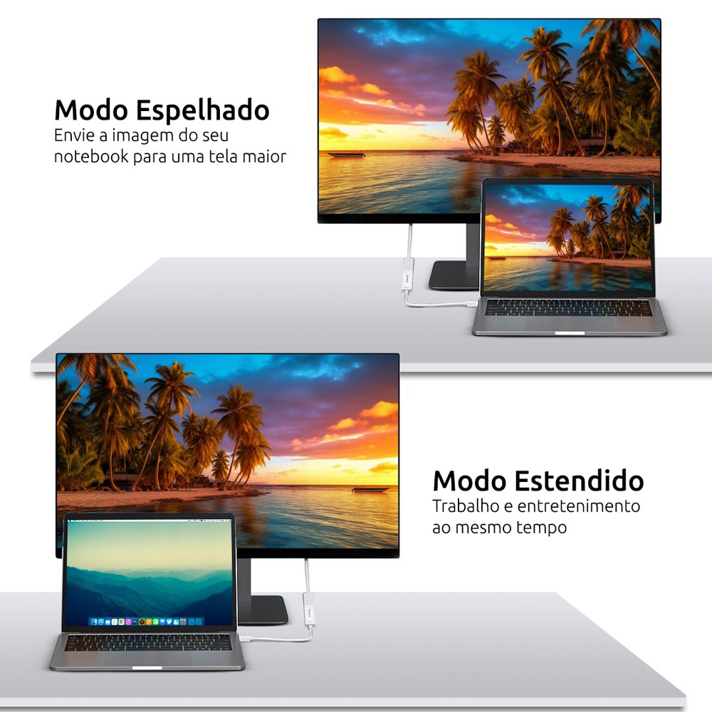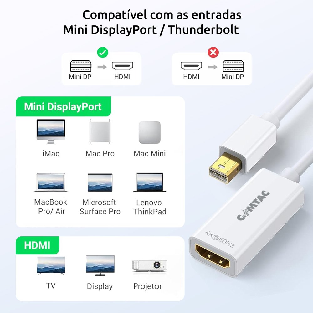 Compatível com Mini DisplayPort 1.2 ou superior Suporte a resolução 4K a 60Hz com alta fluidez Compatível com Thunderbolt 1 e 2 Instalação simples: plug and play Transmite vídeo e áudio com qualidade digital Suporta modos de exibição espelhado (Mirror) e estendido (Extended) Ideal para apresentações e ambientes corporativos Design compacto com acabamento reforçado