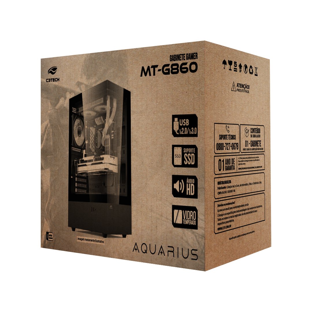 Dimensão de Gabinete: 478*210*425mm Dimensão de Chassis: 333*212*470mm Peso: 6.33kg Possui Organizador de Cabos Possui Filtro Anti-Poeira Compatível com placas-mãe ATX / Micro ATX / Mini ITX Compatível com Water Cooler ESPAÇOS RESERVADOS PARA INSTALAÇÃO Espaços para Baia/Drive 3,5″ : 1 Internas Espaços para Baia/Drive 2,5″ : 2 Internas Espaços para Cooler – Superior: 2 x 12cm Espaços para Cooler – Inferior: 2 x 12cm Espaços para Cooler – Traseira: 1 x 12cm Coolers não Incluso: Imagem Ilustrativa Espaços para PCI: 7 Suporte Water Cooler: Traseiro – 1 x 120mm Superios – 1 x 240/280mm Tamanho Máximo de Placa de Vídeo: 32cm Tamanho Máximo de CPU Cooler: 16 cm CARACTERÍSTICAS DO PAINEL FRONTAL Possui Porta USB Quantidade de Portas USB 2.0: 1 Quantidade de Portas USB 3.0: 1 Possui Conector P2 para Áudio e Microfone Tipo de Codec de Áudio: HD Áudio CARACTERÍSTICAS DE MATERIAL Material de Chassis: SPCC – Aço carbono laminado a frio Espessura de Chassis: 0,60 mm Pintura antiestática e anticorrosiva Frontal e Lateral em Vidro Temperado Altura da embalagem: 52.5 CM Largura embalagem: 27 CM Comprimento embalagem: 49 CM Peso embalagem: 7319 g Part Number/SKU: MT-G860BK EAN do produto: 7908639903040