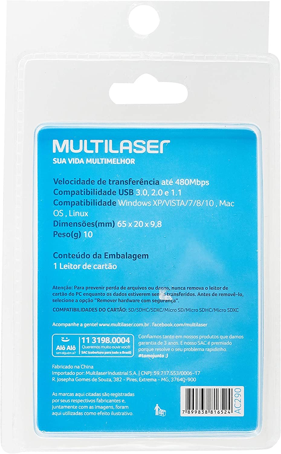 USB 3.0 compatível com 2.0, Velocidade de: 5Gbps (high speed), Velocidade de transferência até: 480Mbps, Plug &, Play, Indicador de LED, Compatível com: USB 3.0, USB 2.0 e USB 1.1, Compatível com, Windows 2000 ou superiores, Mac OS 10.2.8 x ou superior, Apoio Ssecure DigitalTM v1.0 / v1.1 / v2.0 /, SDHC / SDXC (Capacidade até 2 TB), Seguro suporte DigitalTM v3.0 UHS -I ( Ultra High Speed), Transfira do dados do seu cartão, Ideal para: imagens, vídeos e outros documentos. Conteúdo da embalagem, 1 Leitor de cartão, Garantia: 365 Dias Especificações Técnicas Especificação : Marca: MULTILASERPeso Bruto: 0.030 kgAltura: 16.00 cmLargura: 10.50 cmComprimento: 2.00 cmNCM: 84719019EAN: 7899838816524 Imagem Grande : – Garantia : 03 meses contra Defeitos de Fabricação